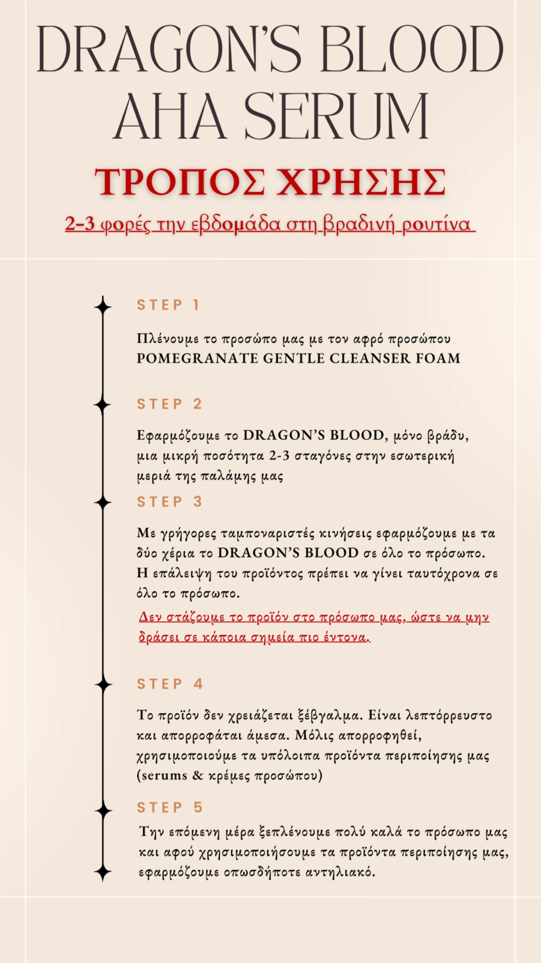 - To dragon’s blood aha serum δεν συνδυάζεται με προϊόντα που έχουν στην σύνθεση τους βιταμίνη C, βιταμίνη Α ( Vitamin Cocktail, vitamin C face cream, Vitamin A face cream