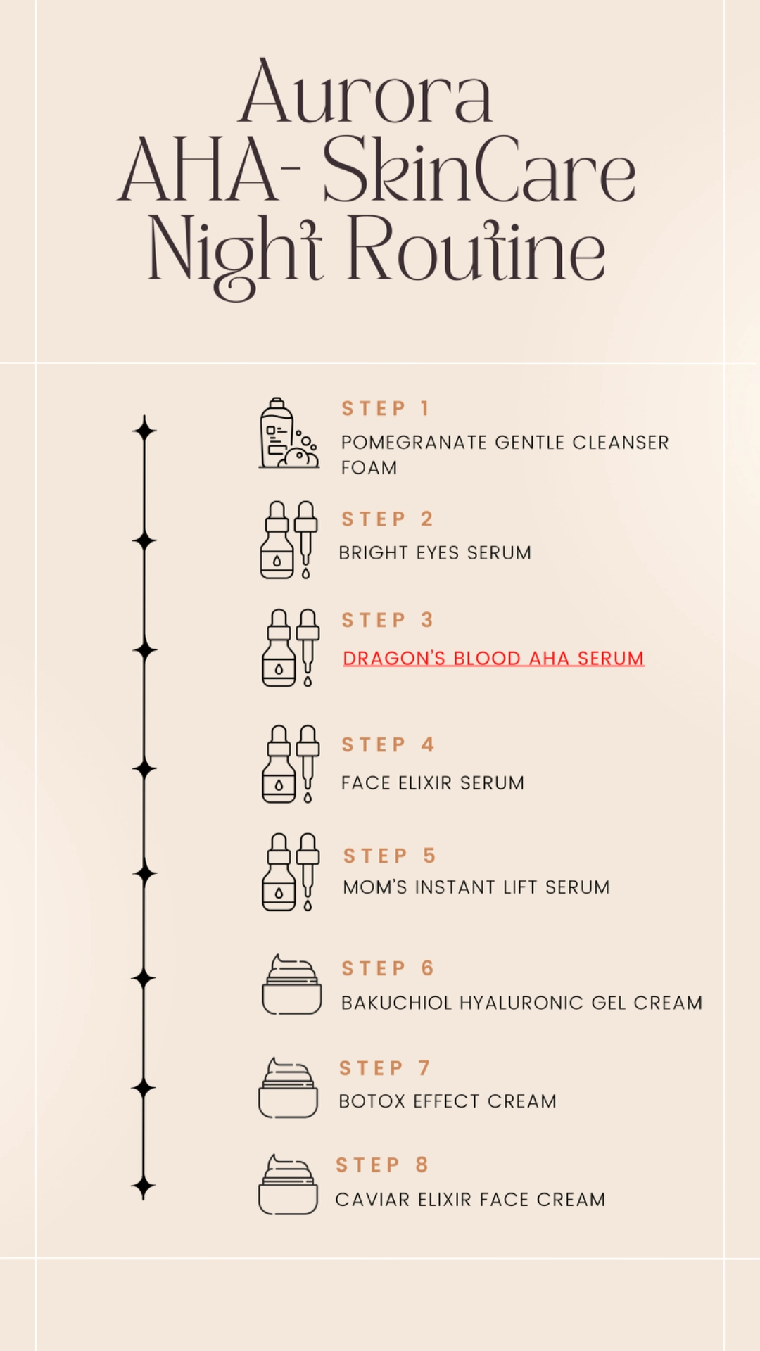 - Το dragon’s blood aha serum συνδυάζεται τέλεια με προϊόντα που έχουν υαλουρονικό, κολλαγόνο, χαβιάρι, πεπτίδια. ( face elixir, mom’s instant lift, botox effect cream, caviar elixir face cream)