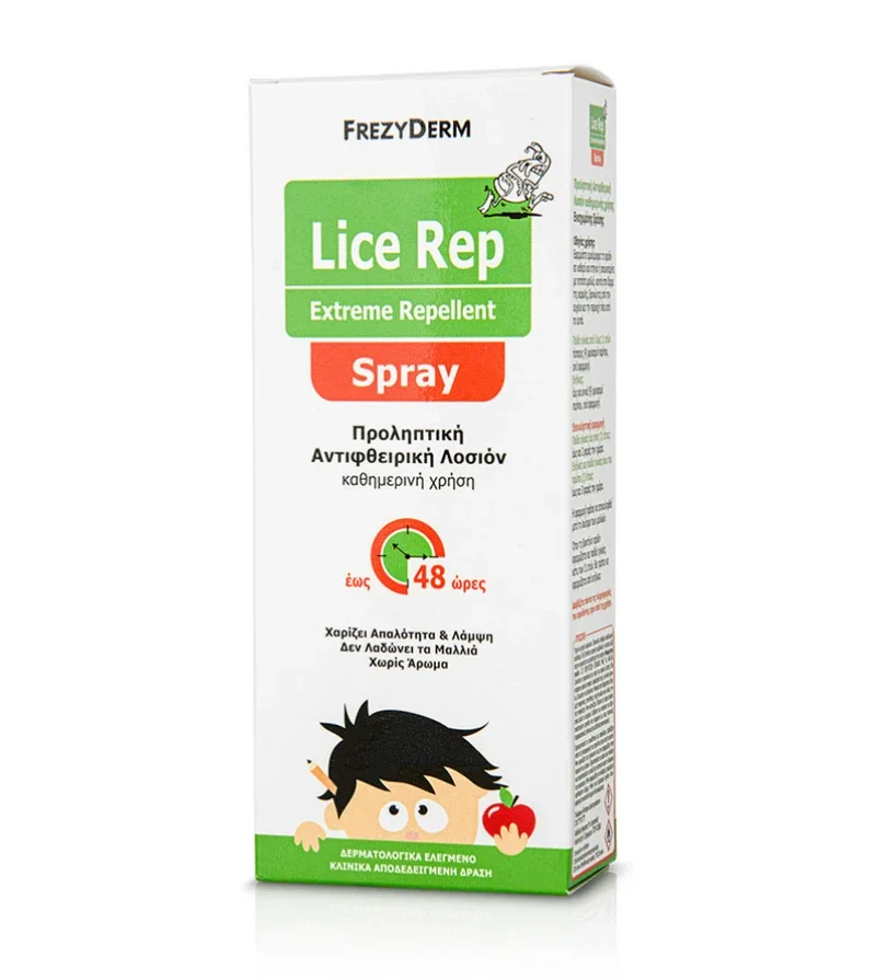 To Lice Rep Extreme Repellent Spray της Frezyderm είναι μία προληπτική αντιφθειρική λοσιόν ενισχυμένης δράσης, για καθημερινή χρήση. Χαρίζει απαλότητα και λάμψη. Δεν λαδώνει τα μαλλιά. Διαρκεί έως 48 ώρες.